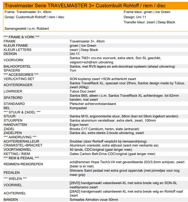 Specificaties van onze fiets: Rohloff met riem en Hope schrijfremmen.